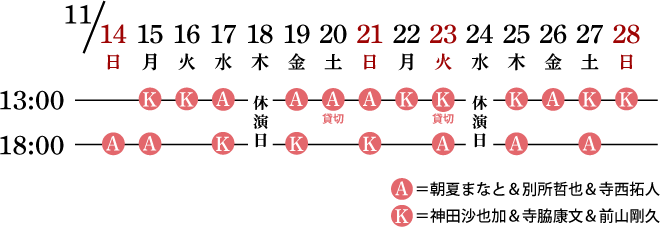 公演日 Wキャスト 会場 12月10日(金) 13:00 A 盛岡市民文化ホール 12月10日(金) 18:00 K 12月11日(土) 13:00 K お問合わせ先盛岡市民文化ホール/毎週月曜日休館 (祝祭日を除く) TEL.019-621-5100